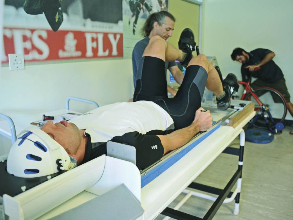 Cyclist Ian McClarty is strapped into the MRI simulator, while Dr Fabien Basset of the Memorial University of Newfoundland